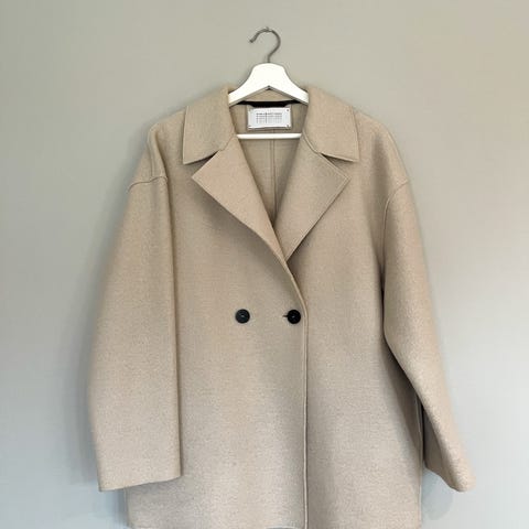 Kåpe i 100% ull fra Harris Wharf London. Italiens størrelse 44, som tilsvarer en 40. Kåpen har en nydelig lys beige farge og lukkes med en knapp. To lommer, som jeg ikke har sprette opp, men det kan man jo gjøre om man ønsker.