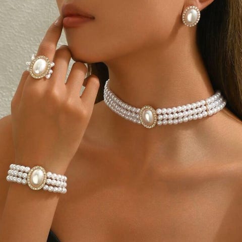 Perle smykkesett med halskjede, ringer og øredobber i ulike farger