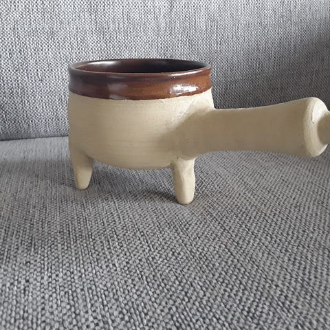 Fin keramisk skjeholder med håndmalt fruktmotiv og gul kant. Praktisk på kjøkkenbenken for å legge fra seg sleiver og skjeer. Hele og pen.