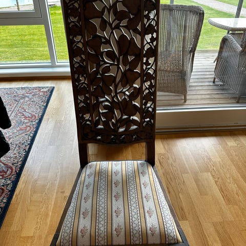 Stolene har utskåret rygg med klassiske kinesiske motiver og utskårne detaljer under setet.