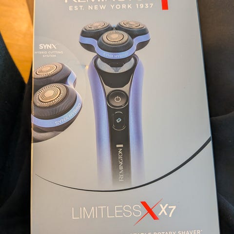 Remington Limitless X7 elektrisk barbermaskin med tre roterende barberhoder. Maskinen er testet tre–fire ganger. Den er nå børstet, vasket med vann og rensevæske for barbermaskiner (isopropanol), og fremstår som ren og tilnærmet ny. I originalemballasje med tilhørende utstyr.