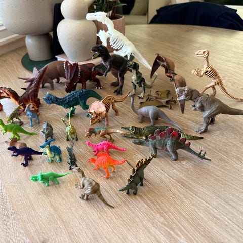 Dyrefigurer/-leker i plast. Den største dinosaruen er 30 cm høy. Selges samlet for 400 kr.