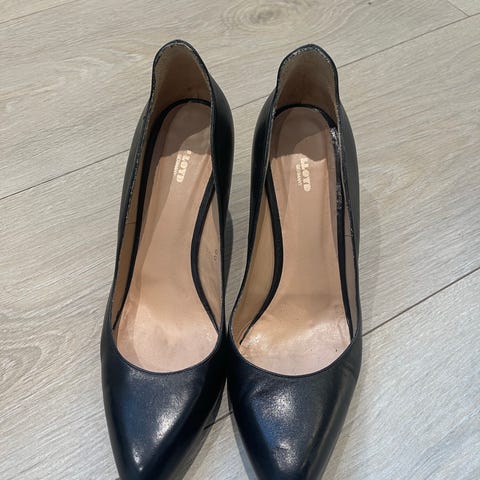 Nydelige Armani pensko i størrelse 40, mørkeblå lakkskinn. Hælene har en klassisk design og passer til formelle anledninger eller pent bruk.