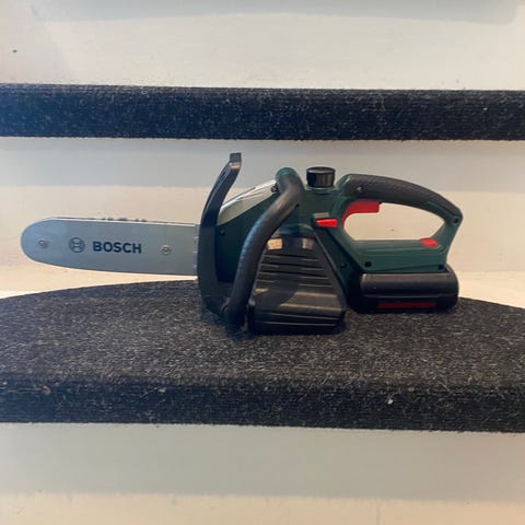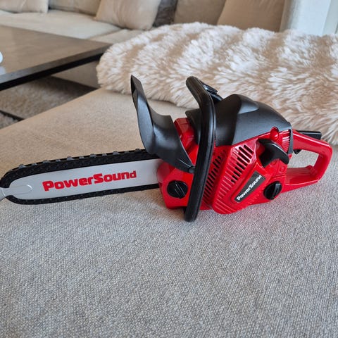 Lekemotorsag og sag. Motorsaga har batteri, og kjedet går rundt når man trykker på knappen. Populær leke her!