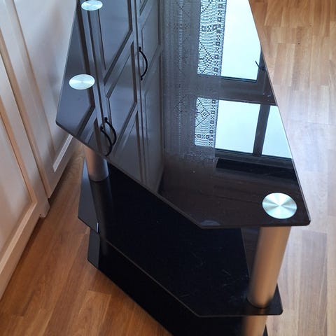 Selger et tv-bord i sort glass med tre hyller.
