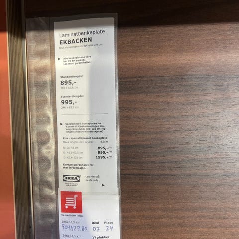 Et 40-skap i serien Kungsbacka fra IKEA med fastmontert dekkplate på høyre side. I tillegg hører 6 trekanthyller lagd av rester fra en benketopp med.