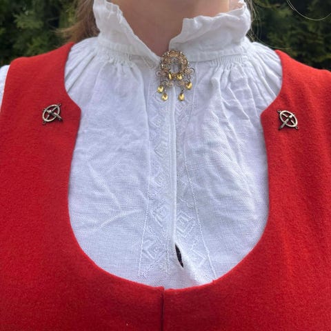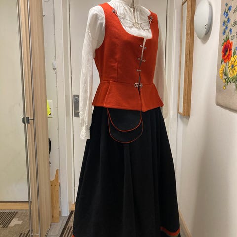 Stakken er forlenget med 4 cm like under linning, men dette synes ikke da det er dekket av foldene på vesten.