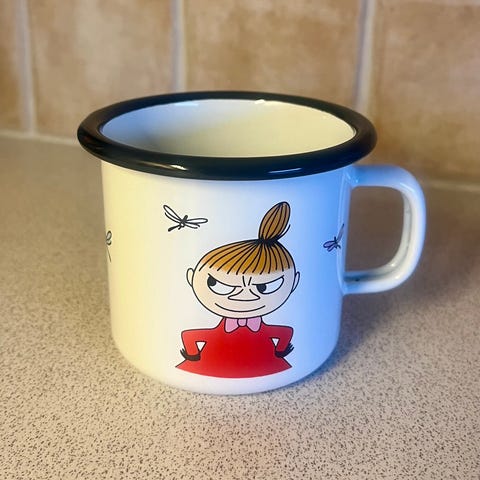 Arabia Muurla emaljekopp i rosa med motiv av Mummitroll. Koppen er laget i emalje og har sort kant. Passer til daglig bruk og samling. Perfekt som turkopp eller barnekopp. Kun brukt en gang.