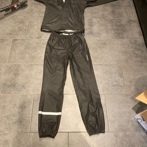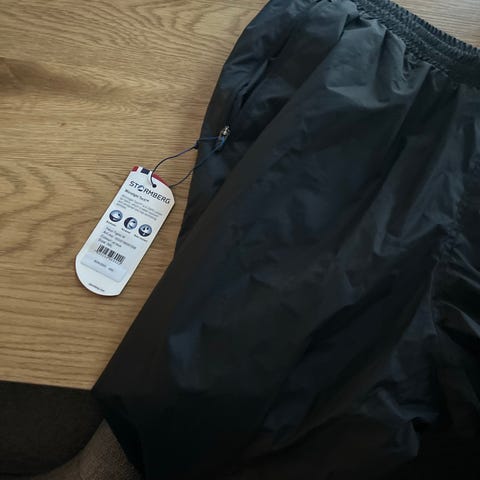 Stormberg regnbukse i størrelse 164, laget av 100% polyester. Buksen er svart og har justerbar midje med snor. Refleks nederst på høyre ben.