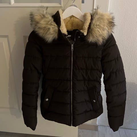 Fin vinter/skijakke til dame str 2, tilsvarer ca str 34. Vattert, men varm og god. Hette med «pels» den er ikke avtagbar, men hette er avtakbar. Dette er en replica.