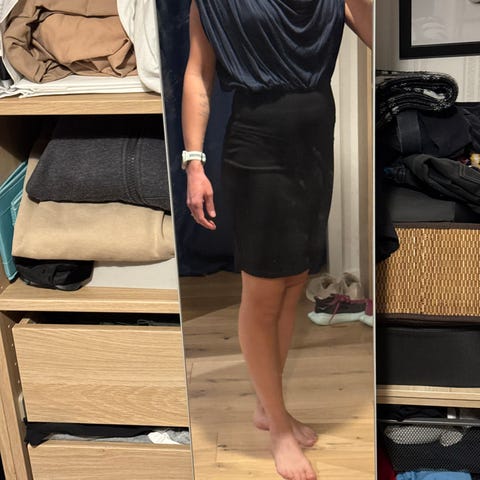 Rydder i klesskapet, og selger denne kjolen som ikke blir brukt, pga at fargen ikke kler meg helt. Den er veldig behagelig å ha på, og man kan bestemme selv hvordan den skal være i fronten. Se bilder for evt alternativer.