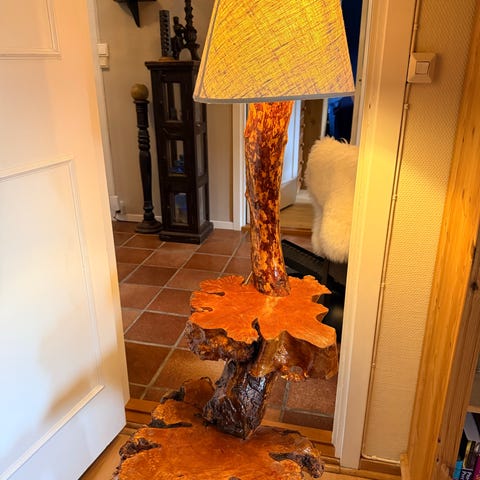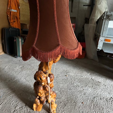 Stilig vintage bordlampe i knute av tre, kåte-rot selges.