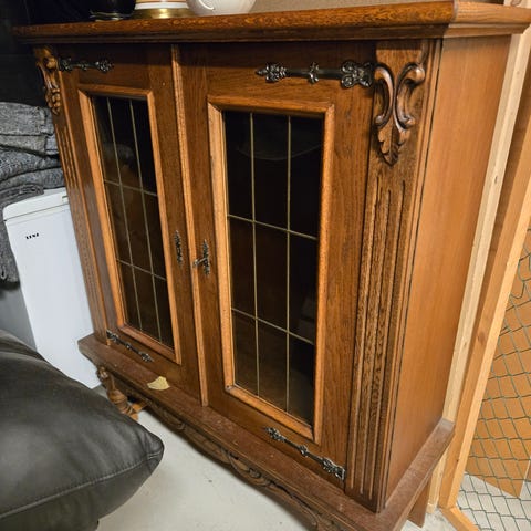 Vitrineskap i solid tre (ikke IKEA) med to glassdører øverst og to treflater/dører nederst.