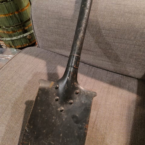Selger en godt brukt m31 hjelm, samme modell som ble brukt under aprildagene 1940. Hjelmen har blitt brukt av industrivernet etter krigen og bærer preg av dette. Innmaten er ødelagt.
