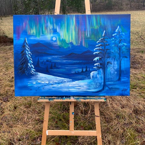 Maleri av en ulv med blå øyne, omgitt av trær i et vinterlandskap. Kunstverket er laget med fokus på detaljer i ulvens ansikt og naturmotivet rundt.