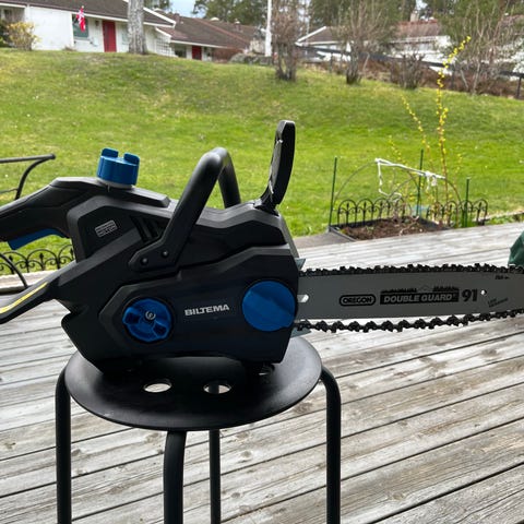 McCulloch motorsag med kjede og sverd. Egnet for beskjæring og kutting av treverk. Elektrisk motor med håndtak for enkel bruk.