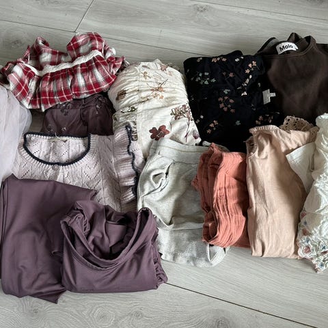 Strømpebuksene er ikke sett over, men jeg tror de skal være i fin stand. Flere av dem har glitter, den ene tightsen er ny. Skjørtene er lite brukt og i fin stand. Det følger også med to par hvite hælsko i str. 33. Skoene var jenta våres favoritt-pensko, så de er en del brukt.
