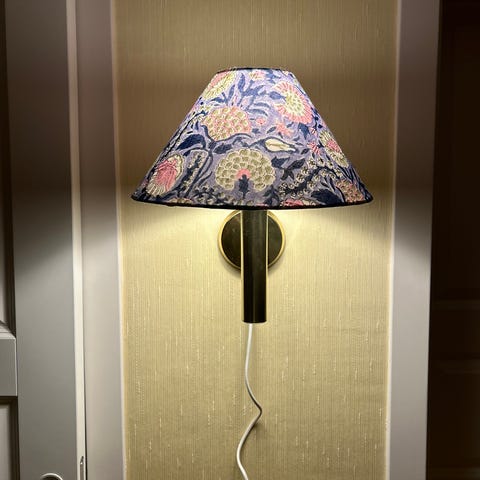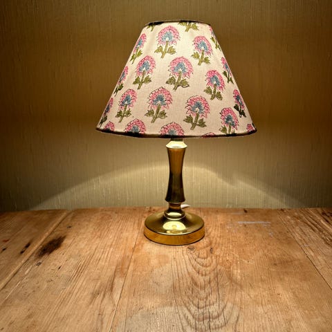 Fin messinglampe med håndlagetlaget skjerm i stoff fra Studio Bazar