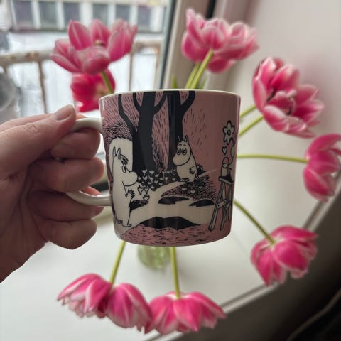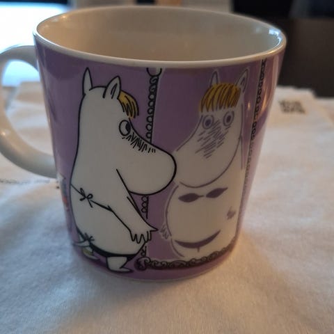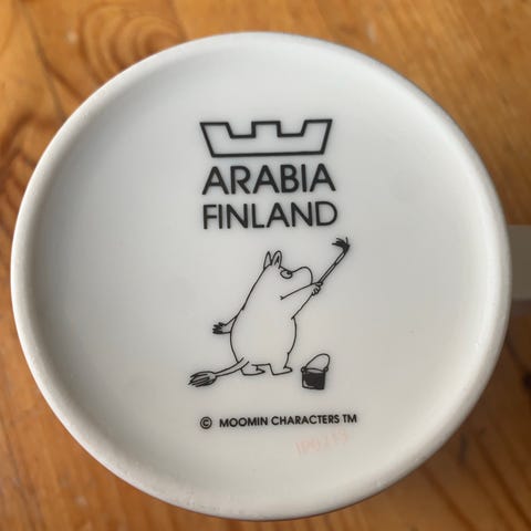 Arabia Mummi kopp med illustrasjoner av Mummi-karakterer. Sesongkopp fra 2017. Et lite hakk som på bildet, ellers i god stand.