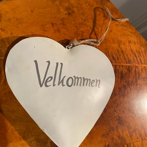 2. Pent brukt stort stillig metall Velkommen hjerte 30 x30 cm kan henges opp på vegg /i vindu. Farge kry og grå skrift. (NB! ikke flat for- eller bakside).