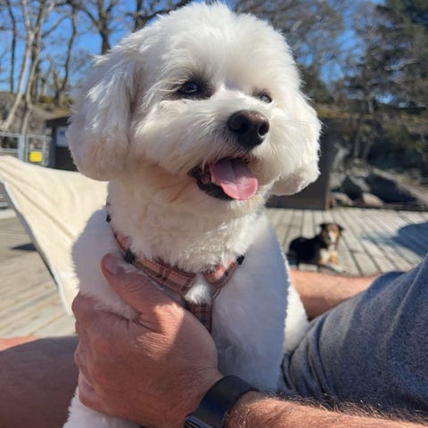 Mann i huset er hjemmeværende og er sammen med hunden hele tiden, ute og inne.