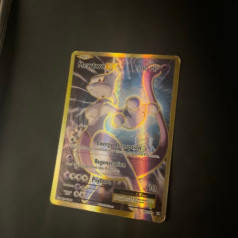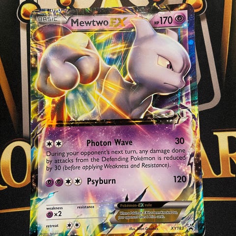 2 store Pokémon Mewtwo EX og Pikachu EX samlekort selges sammen eller separat . Kortene har illustrasjoner av karakterene Mewtwo og Pikachu, og er en del av Pokémon Trading Card Game.Pris er 129kr per stk.