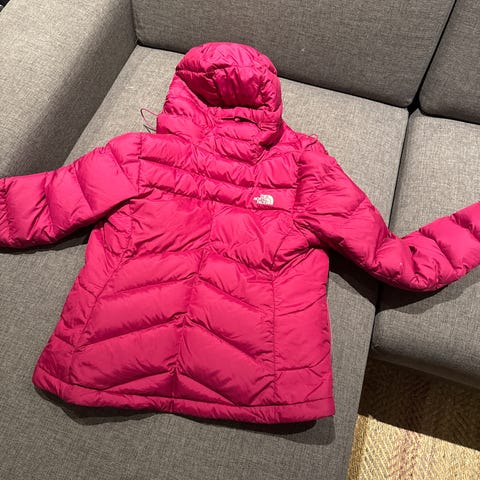 The North Face dunjakke for jenter i størrelse 10/12. liten i størrelsen, passer fint for en 10-åring. Fillpower på 600 som ikke kan sammenlignes med dunkvalitet på jakke kjøpt på Temu.