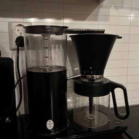 Wilfa Svart Presisjonskaffetrakter i svart farge. Kaffetrakteren har en stor vanntank og en glasskanne med håndtak. Designet inkluderer en presisjonsfilterholder og en base med varmeelement.