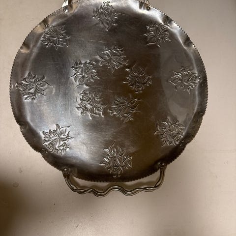 Gammelt tinnfat med rund form og med messing rand