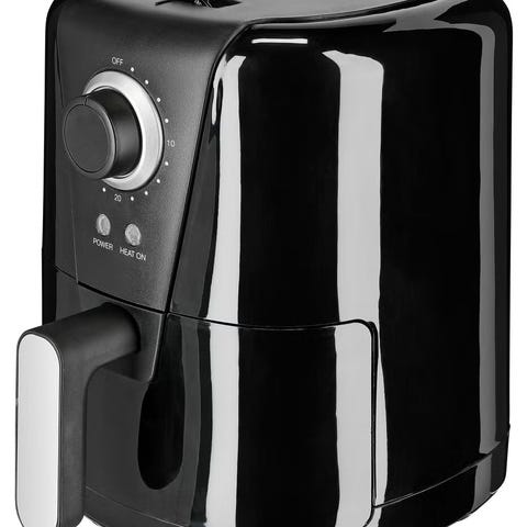 Airfryer i svart farge. Utstyrt med justerbar temperaturkontroll og timerfunksjon for matlaging. Passer til tilberedning av ulike typer mat.