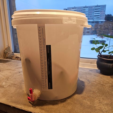 Sett med hjemmebryggingsutstyr inkludert to gjæringsbøtter med lokk og gjærlås, en hevert, og alkomåler. Utstyret er egnet for hjemmebrygging av øl eller annen gjæring.