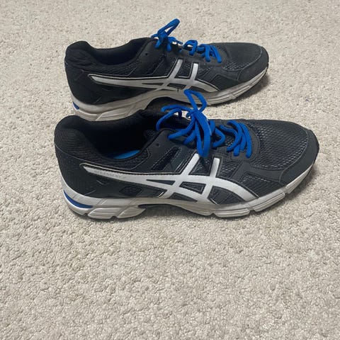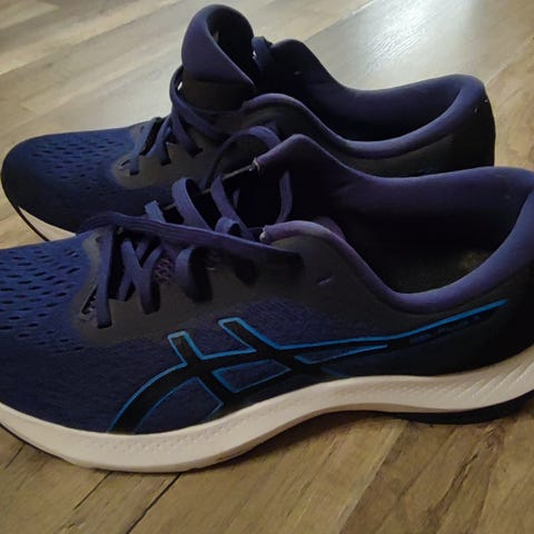 Asics Sneakers joggesko i størrelse 42. Skoene har svart overdel med oransje detaljer og lisser. Egnet for løping og fritidsbruk.