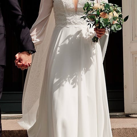 Selger (verdens fineste) brudekjole fra Ricca Sposa kun brukt èn gang i eget bryllup. Kjolen består av vakre blonder og sateng, og er behagelig på.