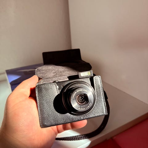 En tom kameraeske med strap, helt ny. Kan brukes til oppbevaring av diverse, som smykker for eksempel. Gi bud :)