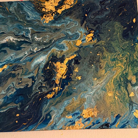 To små abstrakte malerier med tekstur og farger i blått og gull. Maleriene har en rik overflate med tydelige detaljer og fargevariasjoner i blåtoner kombinert med gullaccenter.