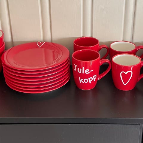 Kjempe fint juleservise sett bestående av 7 tallerkener, 6 kopper, sukker- og fløtemugge, samt pepper og salt beholder.