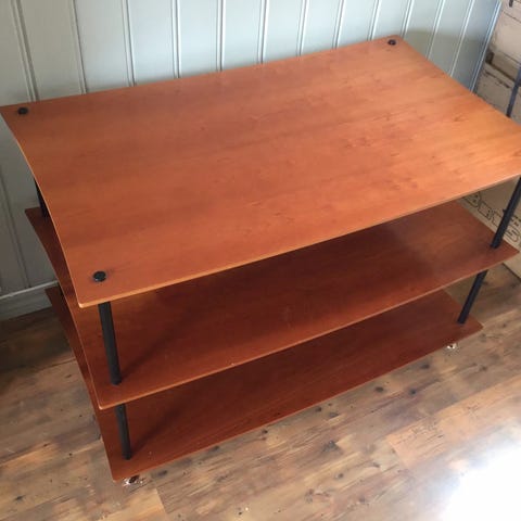 Stilig og solid stereobenk med teakoverflater og stålrør.