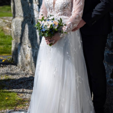 Utrolig vakker brudekjole med lange ermer, blomster og perler selges. Kjolen er ca størrelse 38, og jeg er 170 cm høy og hadde på meg høye hæler som kun var noen centimeter høye. Jeg byttet kjolen til festen, så den er kun brukt under vielsen og middag.
