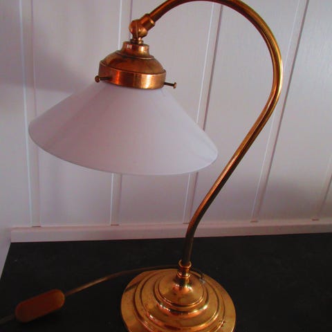 Fin skomakerlampe i messing med glasskjerm.