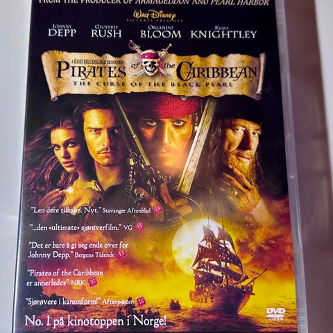 Pirates of the Caribbean The Curse of the Black Pearl DVD. Inkluderer original film med bonusfunksjoner som kommentarspor og slettede scener. DVD-format med flere språkvalg og undertekster. Passer for samlere og filminteresserte.