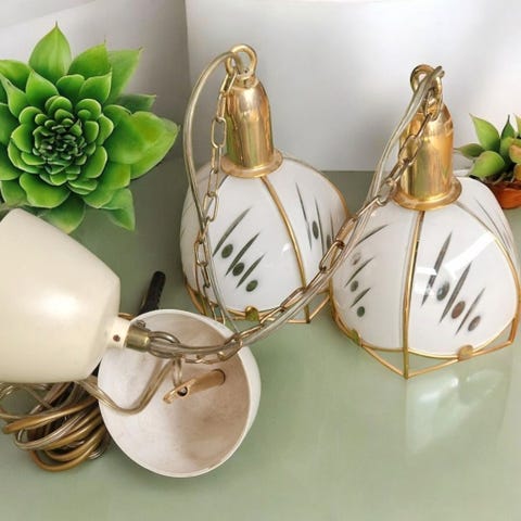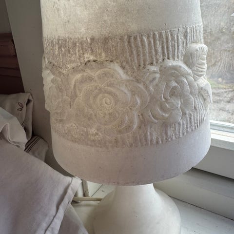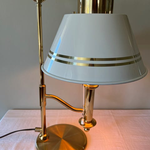 Retro bordlampe med beige skjerm. Lampen har en base i metall med dekorative detaljer - marmordetaljer og en skjerm i beige stoff. Passer som en liten bordlampe for innendørs bruk.