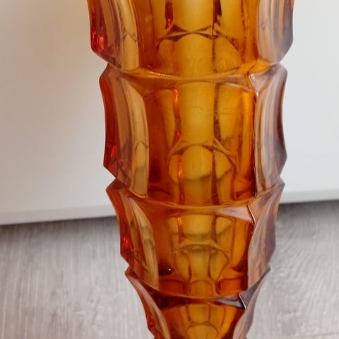 2 utrolig stilige og ettertraktede Art Deco vaser i ravfarget pressglass fra 1930-tallet, produsert av Hermanova Hut/Stolzle glassverk.