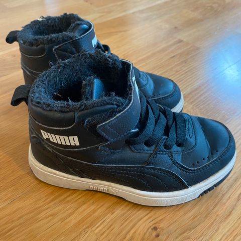 Puma vintersko for gutt i størrelse 29. Skoene er grønne og har faste lisser, lukkes med borrelås for enkel justering. Yttersålen er laget i gummi for godt grep.