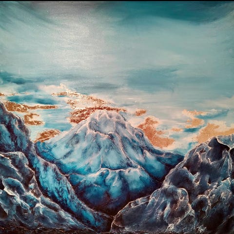 Abstrakt maleri med tekstur og farger i akryl, 80x55 cm. Maleriet har en dynamisk komposisjon med tydelige fargeoverganger og strukturert overflate.