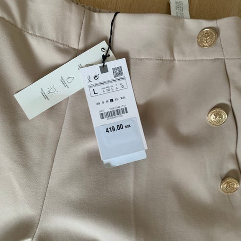 Zara bukser i størrelse L for kvinner. Fargen er beige, og materialet er viskose, polyester og elastan. Bukser med enkel design og lommer. Høyt liv. Pen bukse.