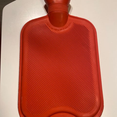 To varmeflasker laget av gummi i fargene rosa og blå. Varmeflaskene har klassisk design og kan brukes til å gi varme ved behov.