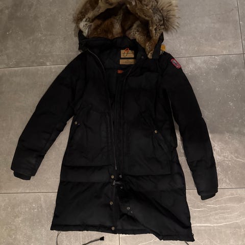 Parajumpers longbear i størrelse L for dame, i svart farge. Jakken har hette med pelskant og er designet for utendørs bruk. Brukt to ganger.