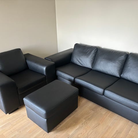 Sofaen er i sort skinn, regelmessig vedlikeholdt.