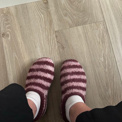 Tovede tøfler strikket etter oppskriften Sailor Slippers.