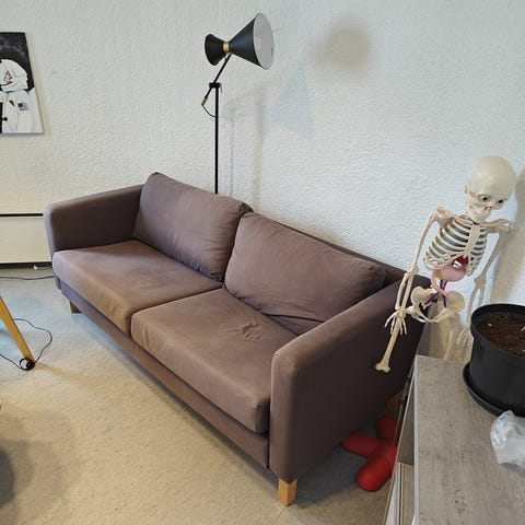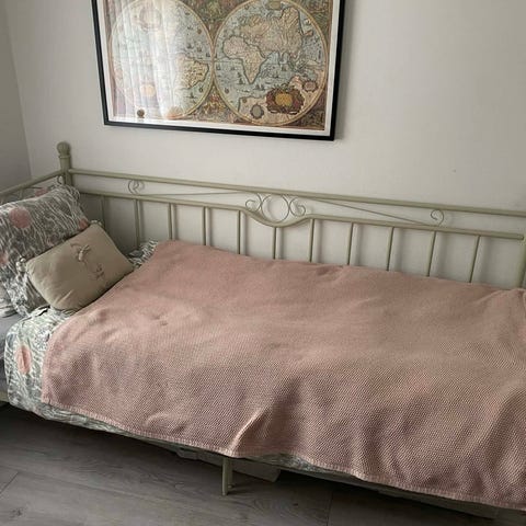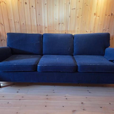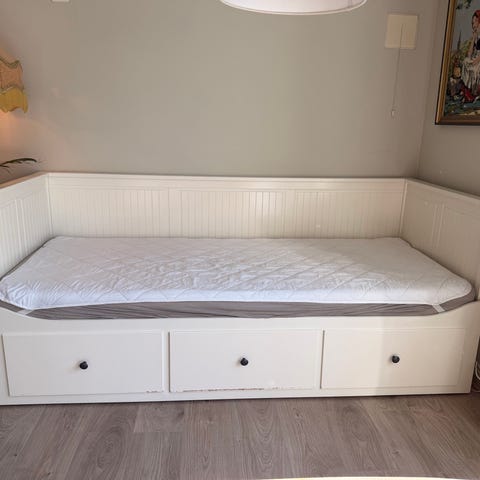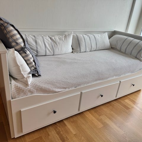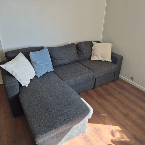 Fint brukbar sovesofa gis bort, da fruen ønsket en oppgradering. Størrelse på madrassen er 200 x 136 cm når brettet ut.